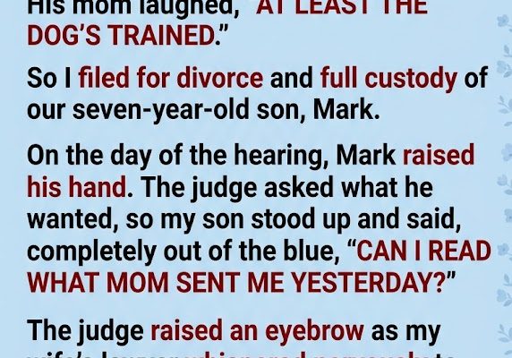 The day after I caught my wife cheating with her co-worker, she said, “I’M TAKING THE DOG—YOU’VE GOT THE KID.” His mom laughed, “AT LEAST THE DOG’S TRAINED.” So I filed for divorce and full custody of our seven-year-old son, Mark. On the day of the hearing, Mark raised his hand. The judge asked what he wanted, so my son stood up and said, completely out of the blue, “CAN I READ WHAT MOM SENT ME YESTERDAY?” The judge raised an eyebrow as my wife’s lawyer whispered nervously to her. “Order in the court!” the judge said and let my son read the message. My heart nearly jumped out of my chest and the entire courtroom froze as he read aloud.