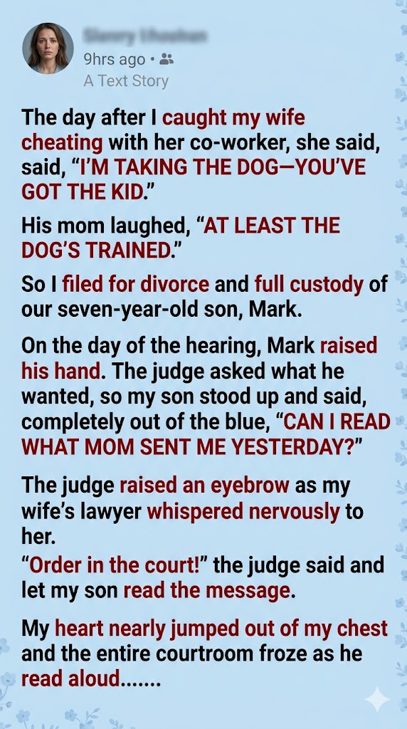 The day after I caught my wife cheating with her co-worker, she said, “I’M TAKING THE DOG—YOU’VE GOT THE KID.” His mom laughed, “AT LEAST THE DOG’S TRAINED.” So I filed for divorce and full custody of our seven-year-old son, Mark. On the day of the hearing, Mark raised his hand. The judge asked what he wanted, so my son stood up and said, completely out of the blue, “CAN I READ WHAT MOM SENT ME YESTERDAY?” The judge raised an eyebrow as my wife’s lawyer whispered nervously to her. “Order in the court!” the judge said and let my son read the message. My heart nearly jumped out of my chest and the entire courtroom froze as he read aloud.