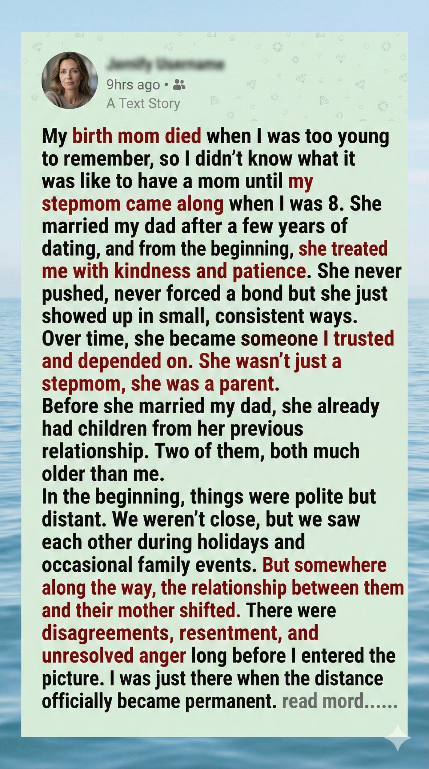 Before she married my father, she had already raised two older children from a previous relationship. Initially, our interactions were polite but remained somewhat distant. We weren’t close at all, though we did see each other occasionally during major holidays and certain family events. However, somewhere along the complex path of adulthood, the relationship between her children and their mother deteriorated sharply. There were deep disagreements, built-up resentment, and unresolved anger brewing long before I ever came into the picture. I just happened to be present when that distance officially calcified and became permanent.