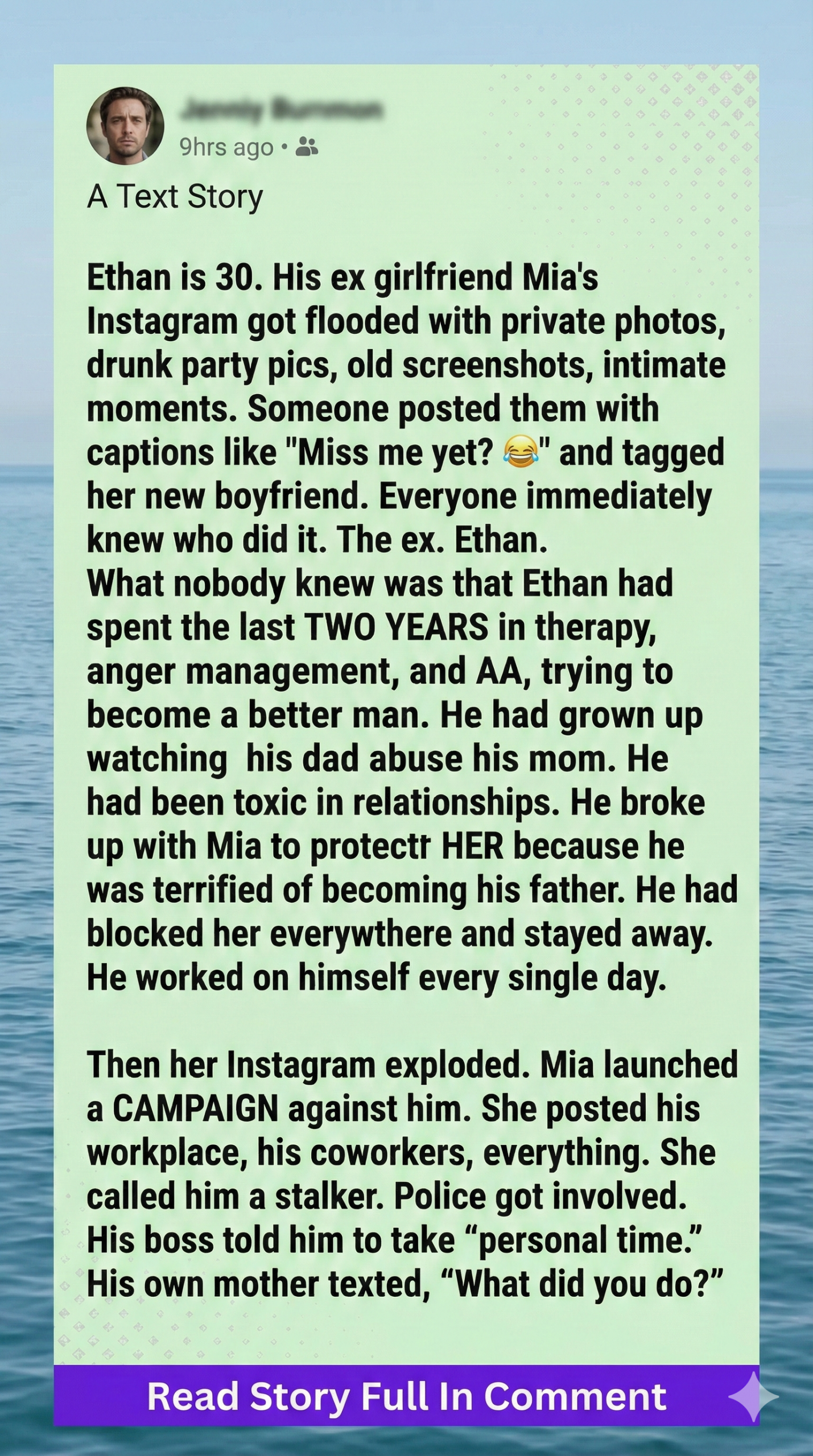 Within minutes, Mia’s story exploded: “He hacked my Instagram. He’s bitter, obsessed, and dangerous.” The comments poured in like fire—strangers, friends, and followers all believed her. By nightfall, I was canceled. My job, my workplace, even my LinkedIn, were public. I overheard coworkers laughing about the “unhinged ex” while pouring burnt coffee. Then Mia posted a tearful TikTok: “Monsters don’t change. They just hide better.” The police showed up with stalking charges. My boss, Sharon, asked me to take “personal time.” Even my mother only texted: “What did you do?”