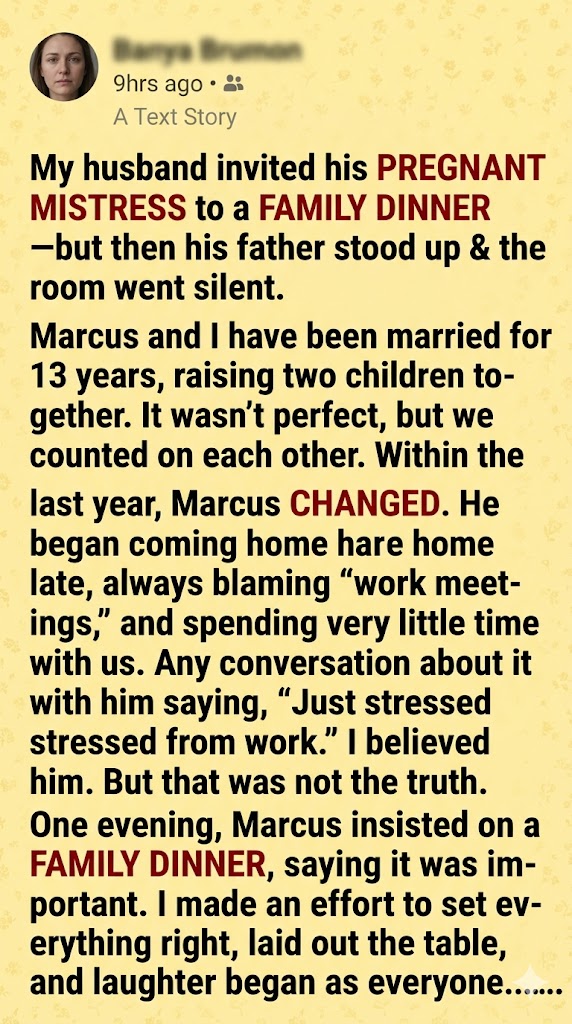 …took their seats. Marcus’s parents, Arthur and Helen, were busy doting on our kids, and for a fleeting moment, everything felt normal. The warmth of the roasted chicken and the ambient chatter made me think that maybe, just maybe, whatever funk Marcus had been in was finally lifting.