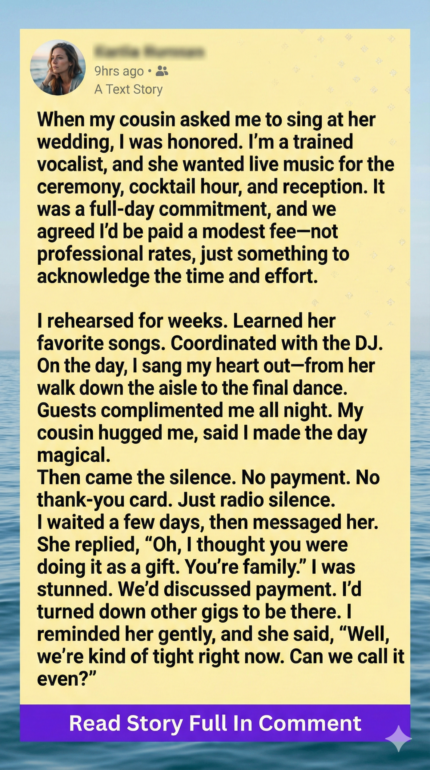 When my cousin asked me to sing at her wedding, I was honored. She said she wanted live vocals for the ceremony, cocktail hour, and reception—and promised to pay me for my time. I spent weeks rehearsing, coordinating with the planner, and even brought my own equipment. The day was beautiful, and I gave it my all. Guests complimented the music, and my cousin hugged me with tears in her eyes. But when I followed up about payment days later, she brushed me off. “It was family,” she said. “I didn’t think you’d actually expect money.” I was stunned—and hurt.