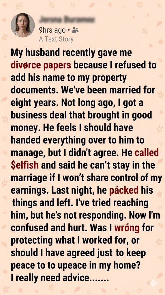 Mark had always been comfortable with how we split our finances. Why the sudden, aggressive desperation to get his name on my newly acquired property? Why the sudden, explosive need to “manage” the windfall from my latest business deal, to the point of throwing our entire marriage away when I said no?