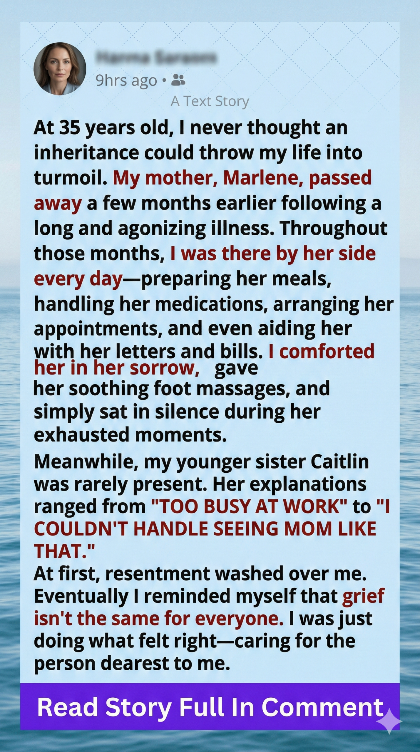 My name is Anna. When my mother, Marlene, passed away three months ago, I flew home from Chicago immediately, leaving my job behind without a thought. For the last six weeks of her life, I was her constant caretaker, helping her sort through bills and letters, and sitting with her in silence. I noticed she’d often update documents, saying, “Just in case,” but I never questioned it. My sister, Caitlin, however, only showed up twice, once dropping off a store-bought pie and later rummaging through the hall closet for jewelry. She barely looked at Mom, insisting, “It’s just too hard, Anna. I’m not strong like you.” I was too exhausted to argue, telling myself everyone processes pain differently, but deep down, a shadow of doubt about her sincerity lingered.