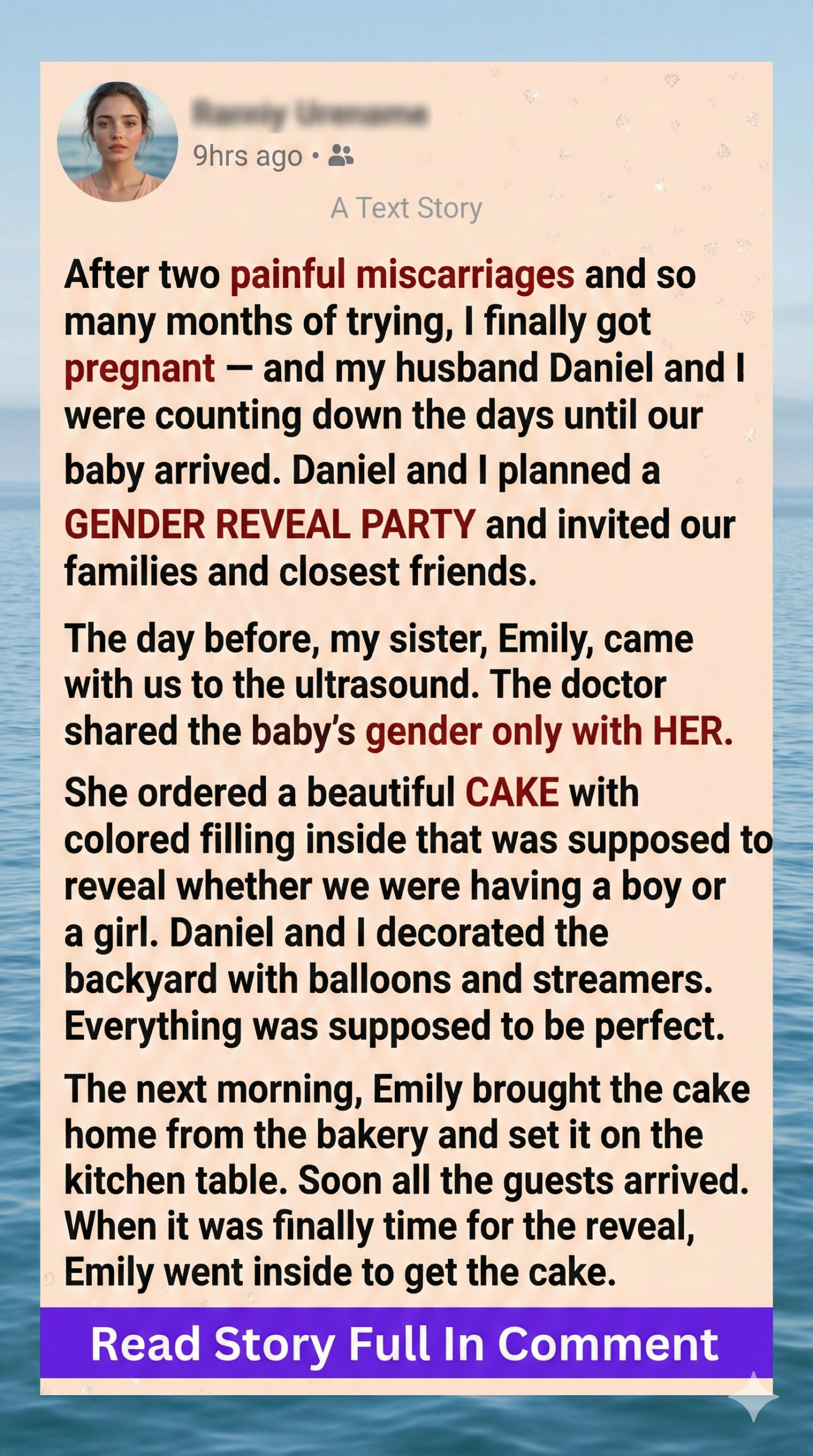 The morning of the party was beautiful. Guests arrived, taking photos and asking for our guesses. Daniel stuck to his prediction of “boy,” and I simply said “girl.” Margaret arrived late, wearing a blue dress and carrying a gift bag with a small toy truck peeking out—her preference was obvious. I told her Emily was in the kitchen preparing the reveal cake. A few minutes later, Emily went inside to bring it out, and then a scream pierced the happy chatter of the party guests. “Emily?” I called out, dropping the tray of cupcakes I was holding and running inside, heart pounding with sudden dread, fearing what disaster could have occurred ten minutes before the big moment.