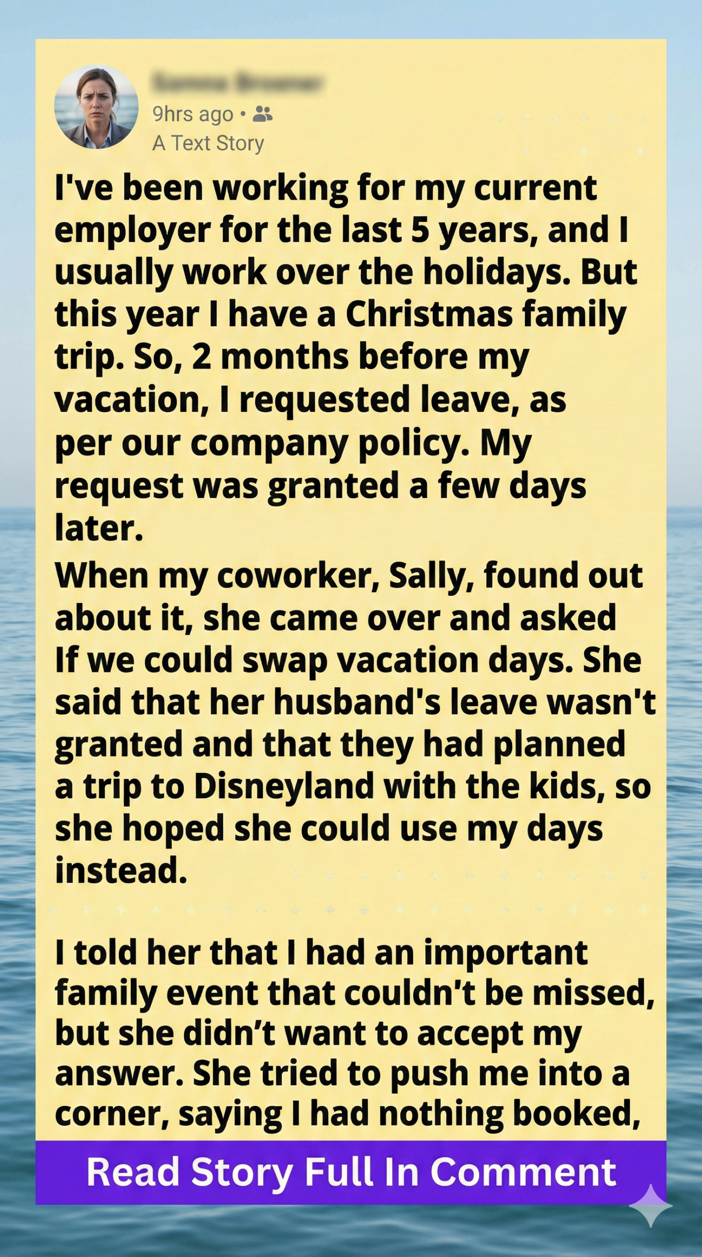 I’ve been dedicated to this employer for five years now, often volunteering to cover shifts during the major holidays. This year, however, was different; I finally had an important Christmas family trip planned, a special event that I simply could not miss. Two months before the holiday, I submitted my leave request, strictly adhering to every part of our company policy, and the request was granted quickly. My plans seemed completely secure until my coworker, Sally, discovered I had approved vacation time. She approached me immediately, looking stressed, and asked if we could please swap our holiday dates. She explained that her husband’s time off had been denied, and they desperately wanted my days for a planned trip to Disneyland with her children.