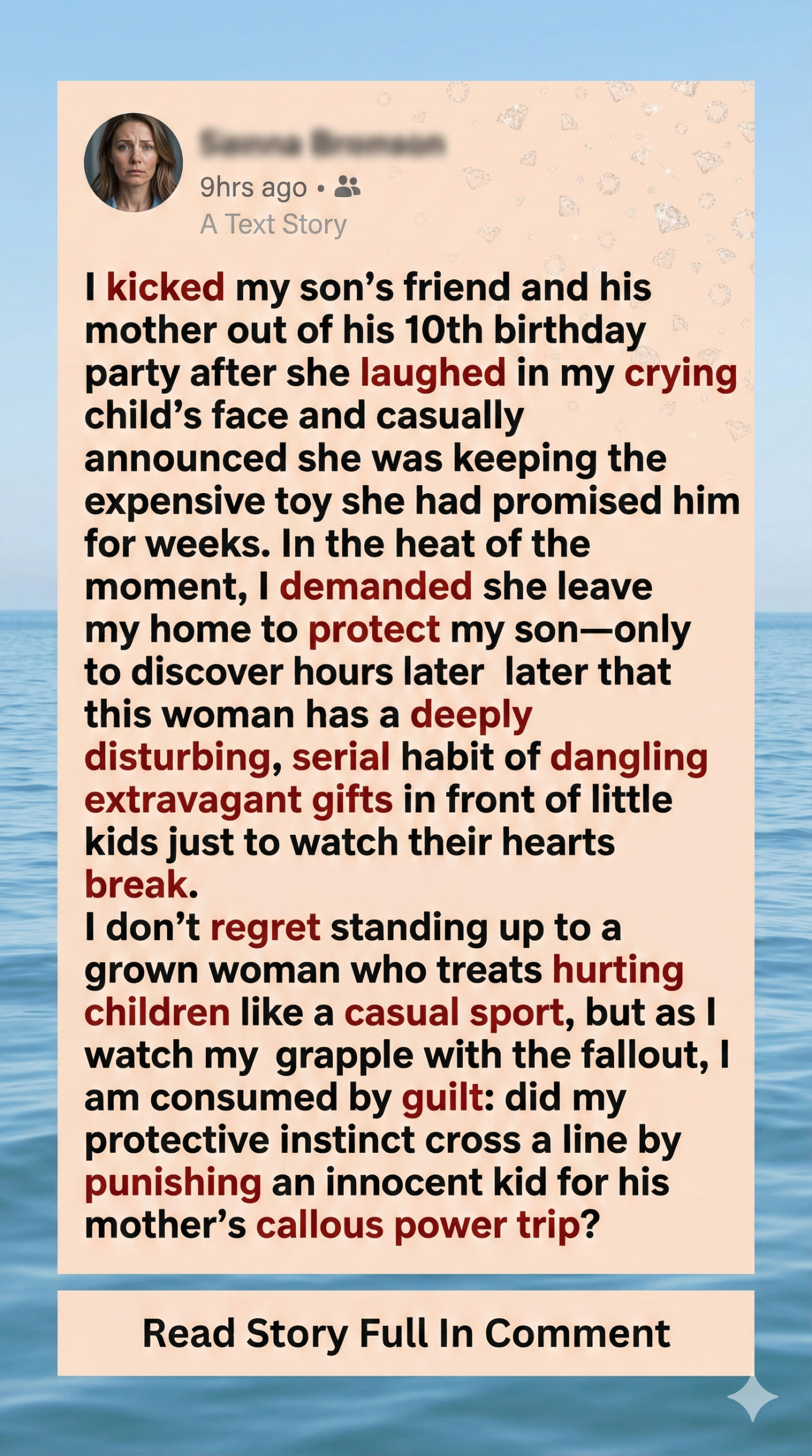 I took a deep, steadying breath. I knew I had to take a firm stand for my child. I turned to Leo’s mom and spoke in a clear, measured voice: “If you came here without the gift you promised, and you truly don’t see a problem with deliberately hurting a child’s feelings this way, then this is absolutely not the place for you. I think you should leave right now.” Leo didn’t even look upset by the confrontation. His mother simply shrugged with total indifference, grabbed his hand, and walked out of the party like nothing of any consequence had happened at all.
