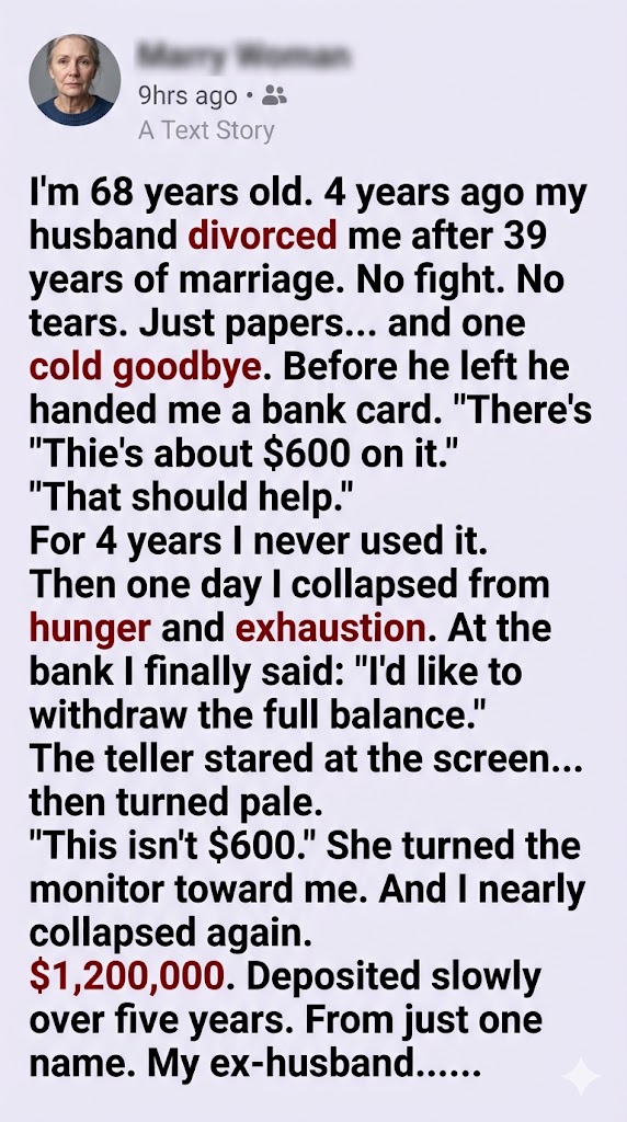 The pieces clicked together with sickening clarity. Arthur hadn’t stopped loving me. He had quietly liquidated his pension, sold off his grandfather’s antiques, worked double shifts, and funneled every single cent into that account. Then, he broke my heart. He divorced me to legally sever my name from his mounting medical debts, taking the financial ruin entirely on his own shoulders.