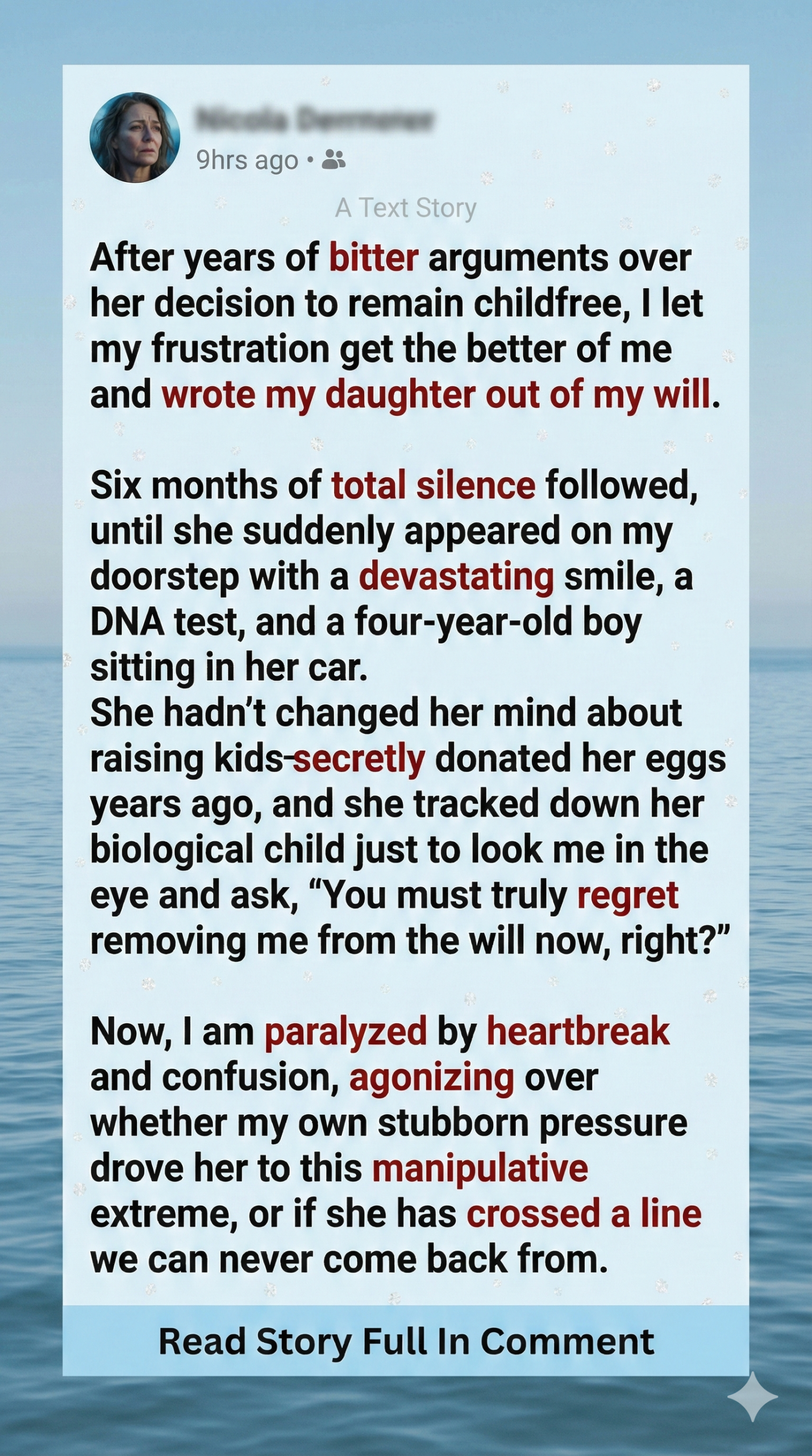 For context, my daughter and I have had arguments for years about her choice to stay childfree. I’ll freely admit it: I judged her for it far more than I truly should have. I wanted grandchildren. I felt she was being deliberately selfish. We argued about the decision way too many times, and after one particularly ugly fight about six months ago, I got petty. I retaliated by changing my will so that everything would eventually go to my nephew instead of her.