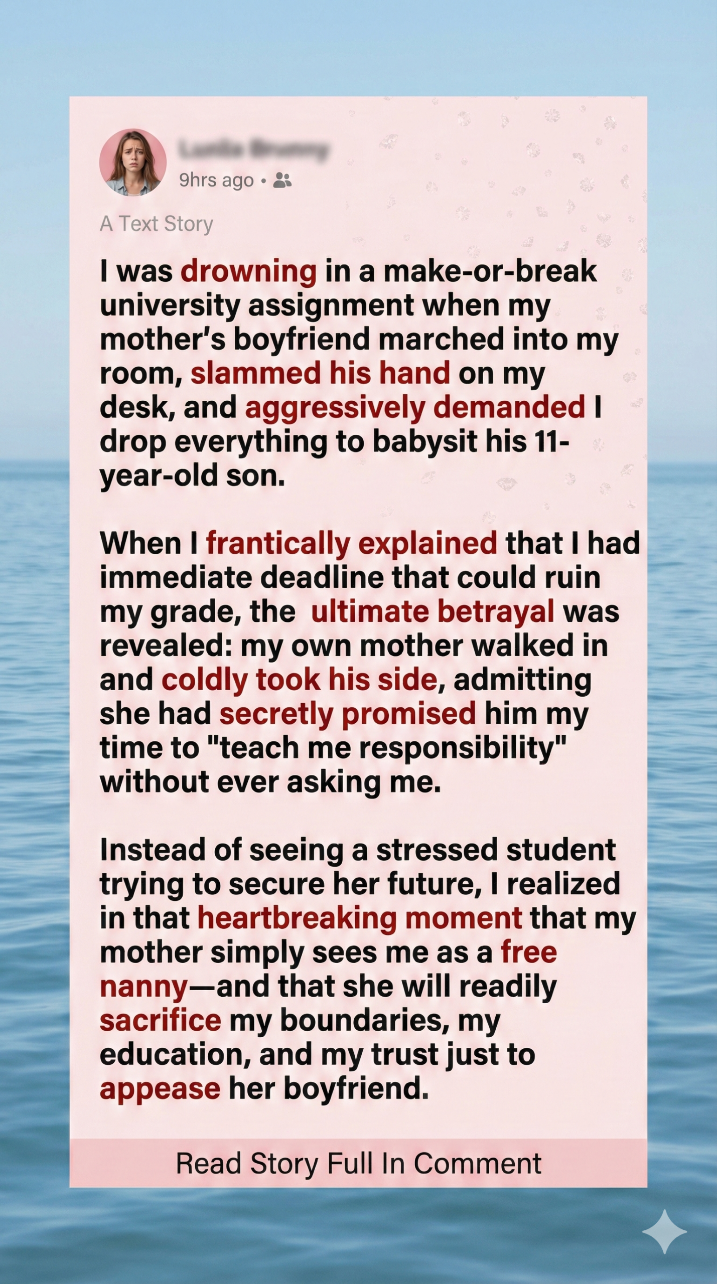What makes my heart heavier is that my mom didn’t see me in that moment. She didn’t consider my boundaries or the fact that I’m trying to manage school and life. She chose her boyfriend over me, and it really hurt. I love my mom, but this weekend made me seriously question how much she actually values me and respects my life.