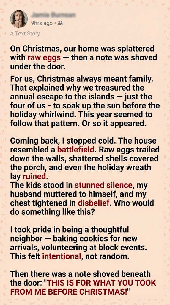 Sarah spent the next four hours scrubbing our siding and power-washing our porch until midnight. We didn’t press charges, but things were never quite the same. The eggs washed off, but the trust? That was harder to clean.