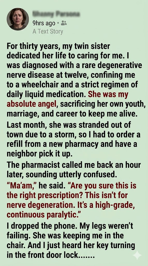 The key was turning in the front door. The brass knob slowly rotated. I stared at my useless, atrophied legs, my mind spinning violently. Thirty years. Thirty years of sponge baths, pureed food, and tearful declarations of gratitude. Thirty years of watching my twin sister, Clara, accept the pitying, admiring gazes of our neighbors as the martyred saint who gave up everything for her crippled half.