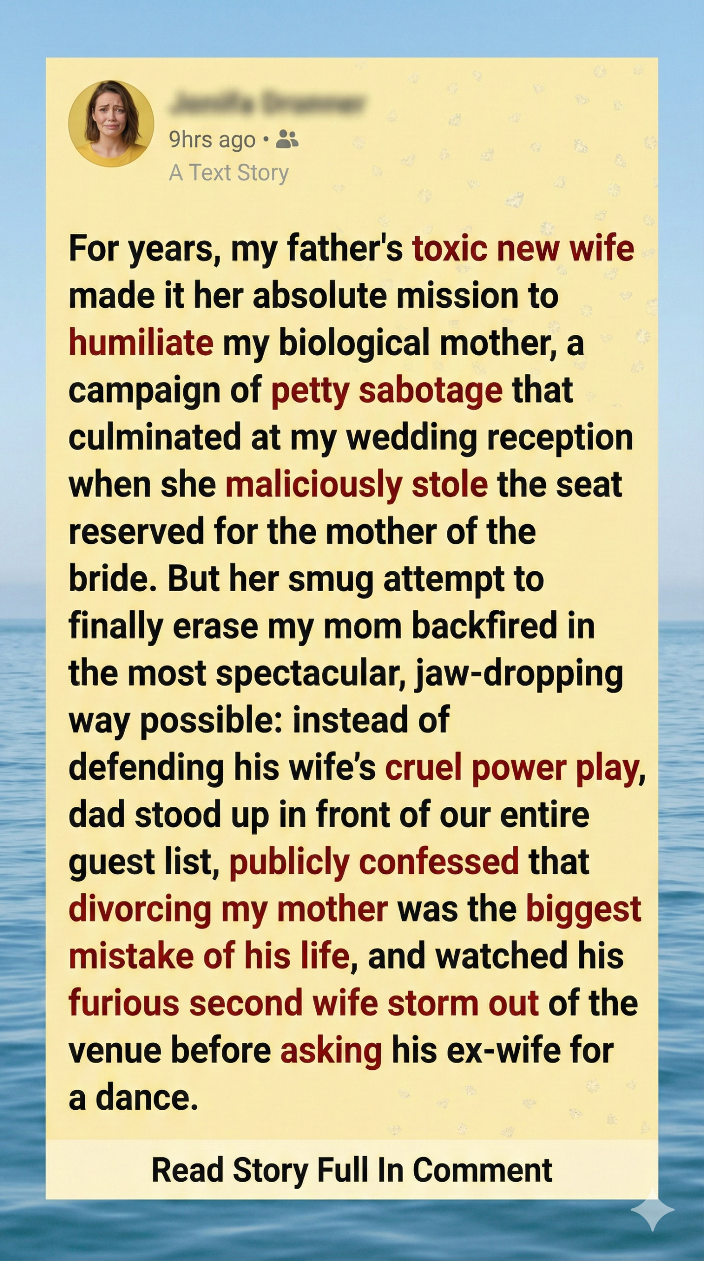 I confronted her, told her to stop humiliating my mom. My dad brushed it off, saying I was “too sensitive.” But Debra’s sabotage continued—mocking my mom behind her back and pushing herself into every milestone. When I got engaged, I begged my dad to make sure Debra wouldn’t cause drama at the wedding. He promised. He didn’t deliver.