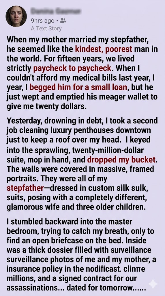 My heart hammered against my ribs like a trapped bird. The mop handle clattered against the imported marble floor, the sound echoing through the cavernous, silent penthouse. I stared at the open briefcase, my soapy, calloused hands shaking so violently I nearly tore the glossy surveillance photos.