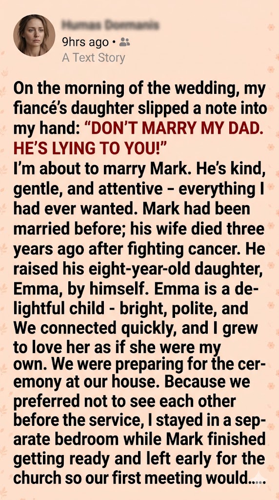 My heart hammered against my ribs as I stared at the crumpled piece of paper. The childish handwriting was frantic, the letters jagged. He’s lying to you. I peeked out the second-story window. My bridesmaids had just pulled away in the first limousine, taking Emma with them. I had exactly twenty minutes before the final car arrived for me.