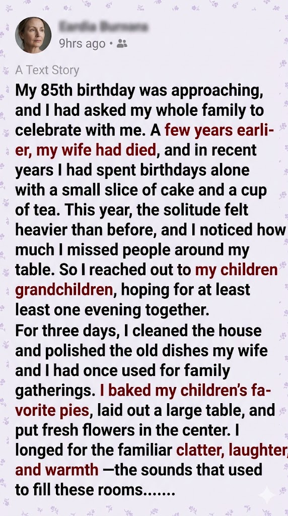 I spent three days preparing for my 85th birthday party, but when my family finally arrived, they didn’t bring presentsβ€”they brought eviction papers. πŸŽ‚πŸ’”πŸšοΈ