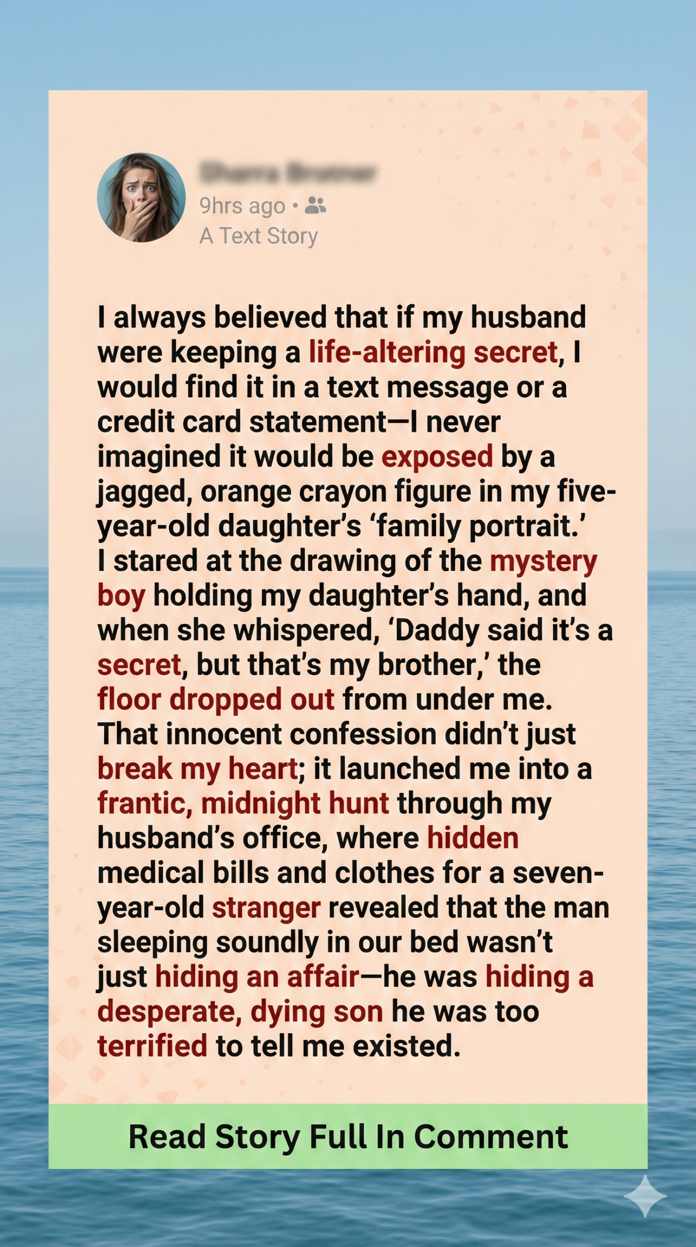 There it was: a cheerful drawing. Me, smiling. Mark, tall and waving. Anna, right in the middle. But then, my heart stumbled. Next to Anna was another figure. A boy. Drawn the same size as her, holding her hand like he belonged there. Something was very, very wrong.