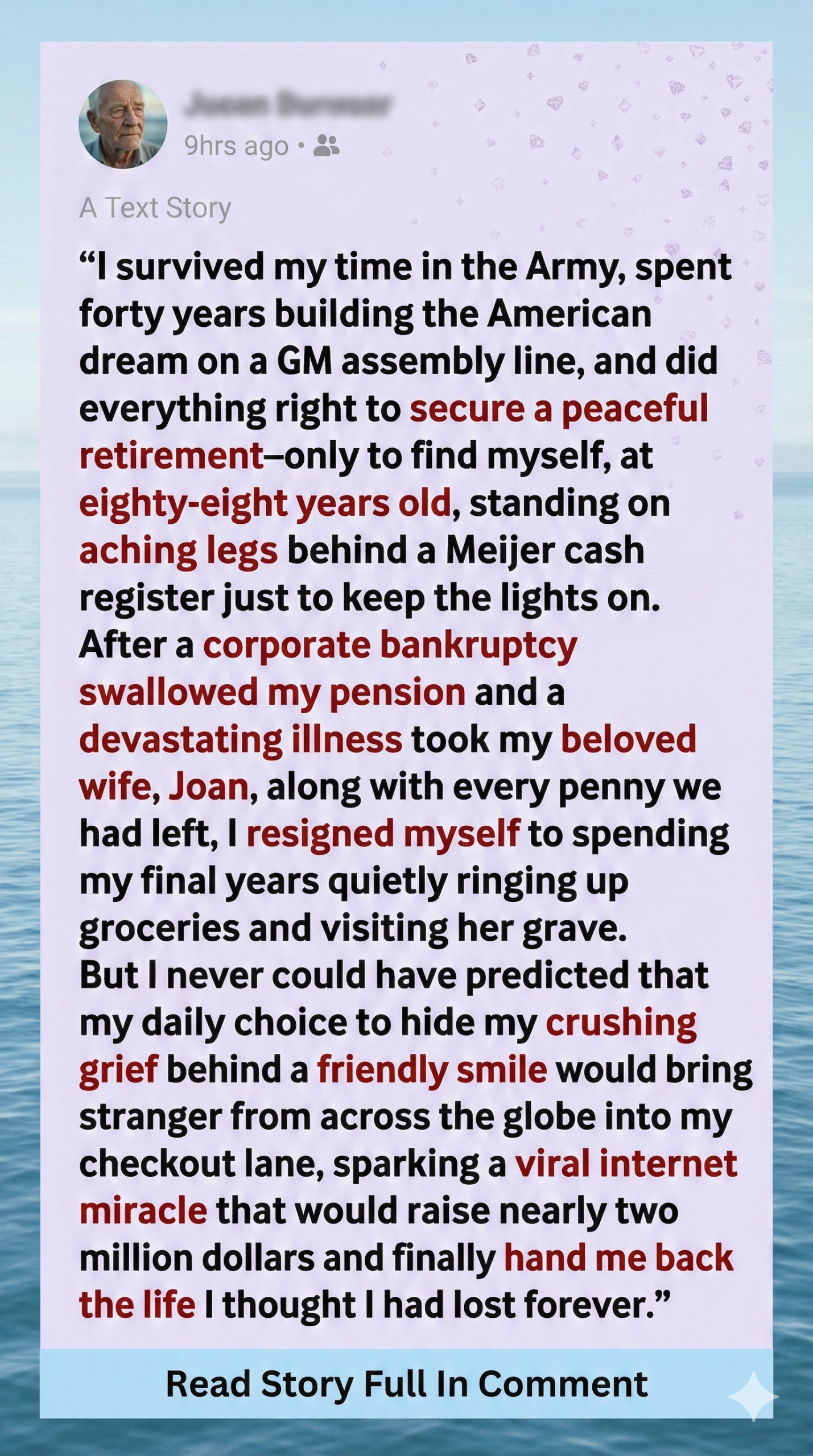 In 2012, disaster struck. GM’s bankruptcy wiped out my pension, upending decades of hard work. The heartbreak deepened when my beloved wife of more than 50 years, Joan, became gravely ill. I was her primary caregiver, watching helplessly as medical bills drained our life savings, especially after she lost her healthcare coverage. I tried to keep us afloat, selling our home and other properties. It kept us going—for a while.