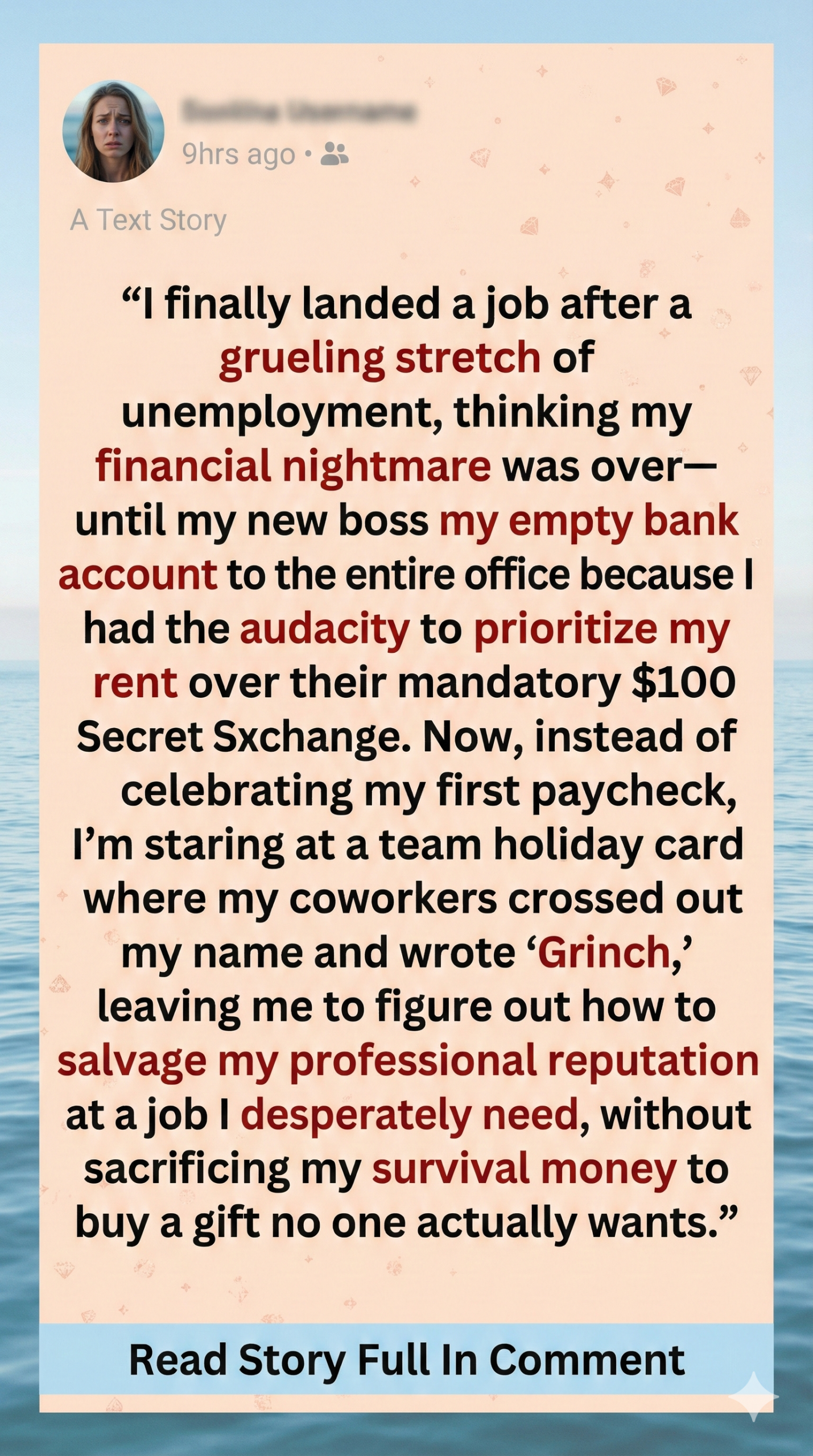 She asked me why, and I told her, “Sorry, I’m not spending money on gifts when I’m struggling to pay rent!” She seemed to understand and went out to tell my coworkers not to include me in the gift exchange. Everyone initially said, “It’s fine! No worries! We’ll catch you next year.”