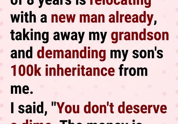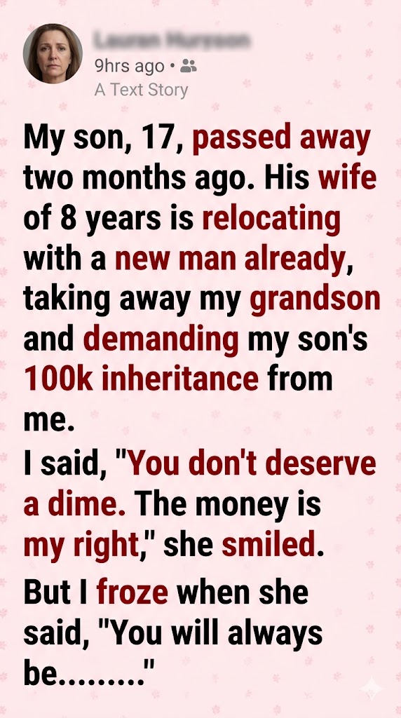 My son, 17, passed away two months ago. His wife of 8 years is relocating with a new man already, taking away my grandson and demanding my son’s $100k inheritance from me. I said, “You don’t deserve a dime. The money is my right.” She smiled. But I froze when she said, “You will always be…”