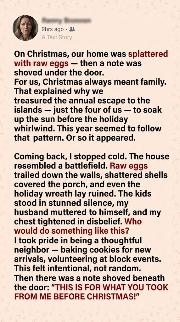 It wasn’t the Christmas homecoming I had expected. But as we stood there in the cold, scrubbing away the mess to reveal the clean paint underneath, talking about kids and chaotic mornings, I realized the note had been wrong. We hadn’t taken anything. But in the end, we had gained something: we finally really knew our neighbors.