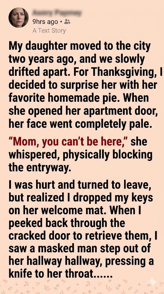 My daughter moved to the city two years ago, and we slowly drifted apart. For Thanksgiving, I decided to surprise her with her favorite homemade pie. When she opened her apartment door, her face went completely pale. “Mom, you can’t be here,” she whispered, physically blocking the entryway. I was hurt and turned to leave, but realized I dropped my keys on her welcome mat. When I peeked back through the cracked door to retrieve them, I saw a masked man step out of her hallway, pressing a knife to her throat.