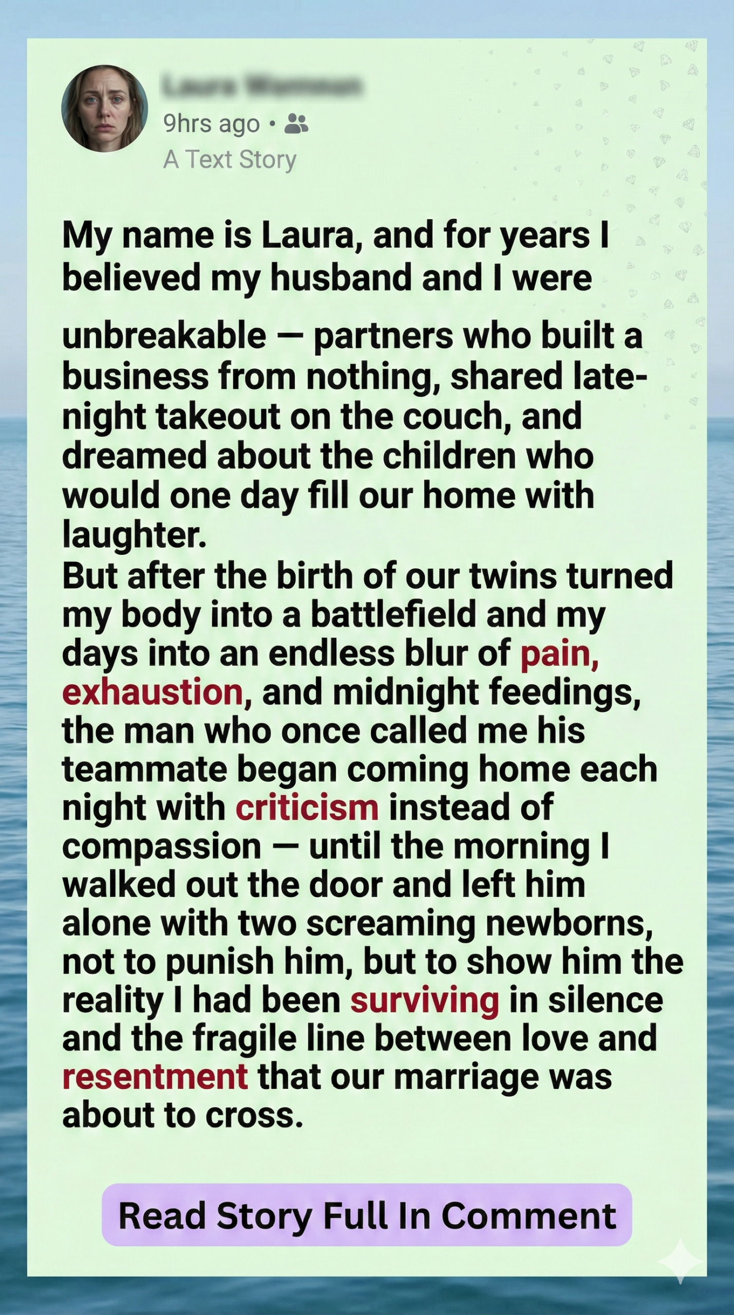 “Laura, I’m so sorry,” he said, his voice shaking. “I had no idea it was like this. I thought you were exaggerating, but I couldn’t even handle one day! How do you do this every single day?”