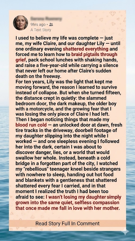 That night, I went home with my daughter. The next week, I was there with them under the bridge, a thermos full of soup in my hand, helping to serve the food. I learned that the real reason Lily was sneaking out was not because she was a bad girl, but because she was a wonderful one. She had inherited her mother’s heart. I may have failed to understand her, but she had never failed me.