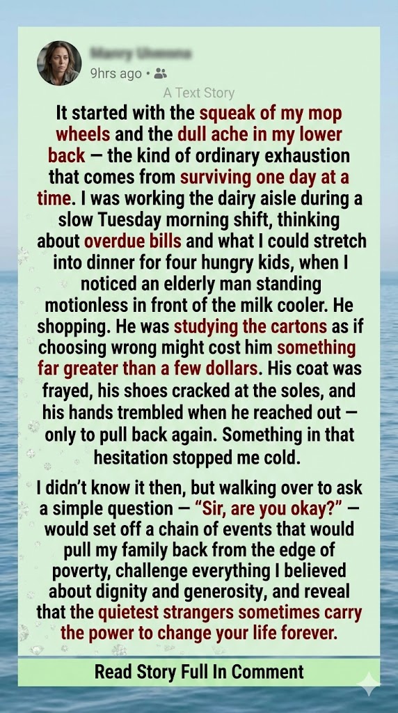 It was just another ordinary shift at the grocery store, the kind where your feet ache, your hands are sticky, and every aisle feels like a tiny battlefield. I was pushing my mop down the dairy aisle when I noticed an old man standing there, staring at the milk as if it held all the secrets of the universe. I had no idea that this simple, quiet moment would change the course of my life—and the lives of my children—forever.