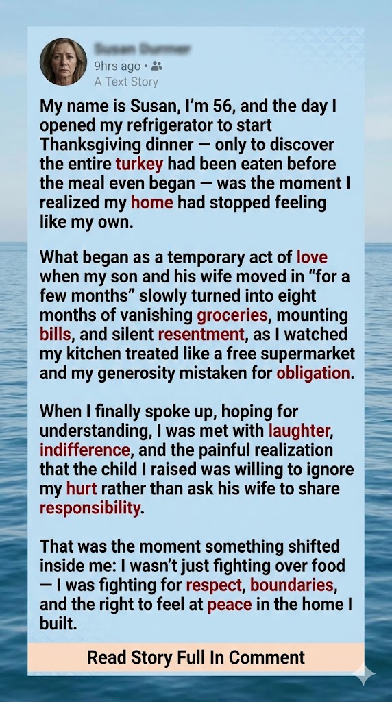 My name is Susan D., I’m 56, and my patience has completely run out. My son and his wife moved in “just for a few months” after some personal issues. I was happy to help. I stocked the fridge, cooked meals, and tried to make everyone comfortable in my home.