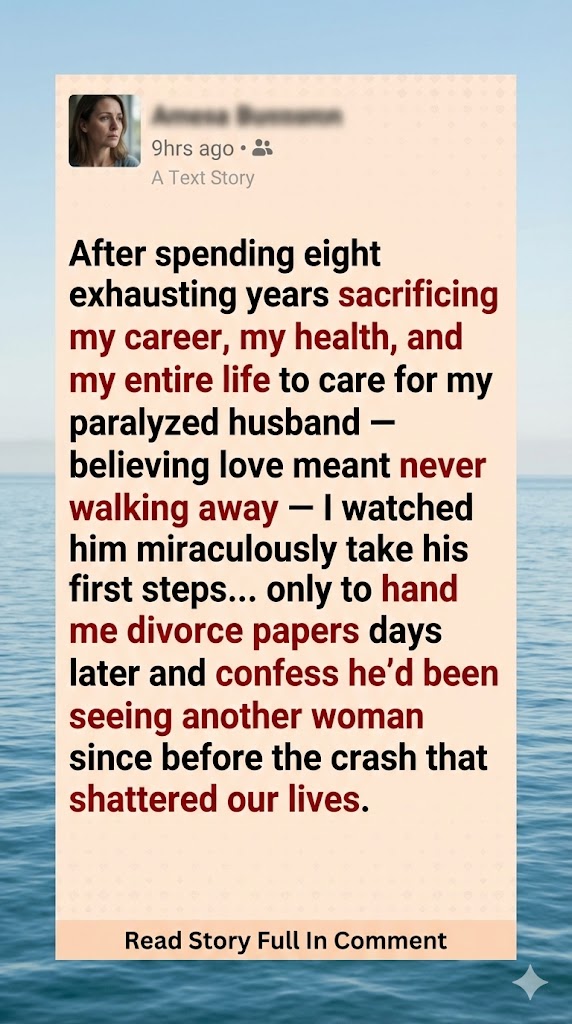 After eight years of sacrificing everything to care for my paralyzed husband, I watched him take his first steps with tears of joy streaming down my face. One week later, those same hands that had fed him, bathed him, and held him through his darkest moments were trembling as I held divorce papers and learned the devastating truth.