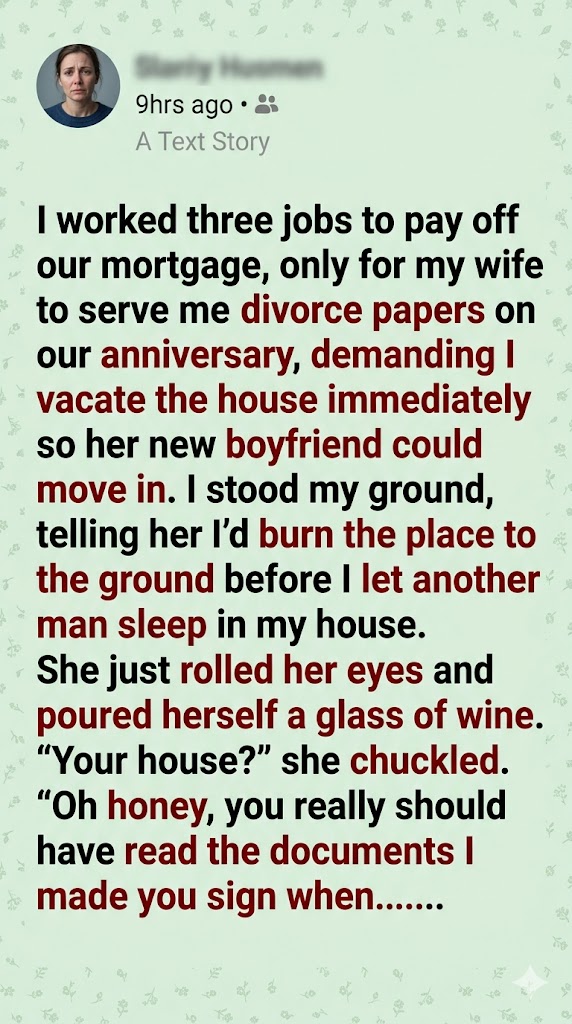The exhaustion of the last two years—the eighty-hour workweeks, the overnight stocking shifts, the weekend landscaping gigs that left my hands blistered and raw—crashed into me all at once. I looked around the living room. I had built the fireplace mantle with my own hands. I had sanded the hardwood floors until my knees bled.