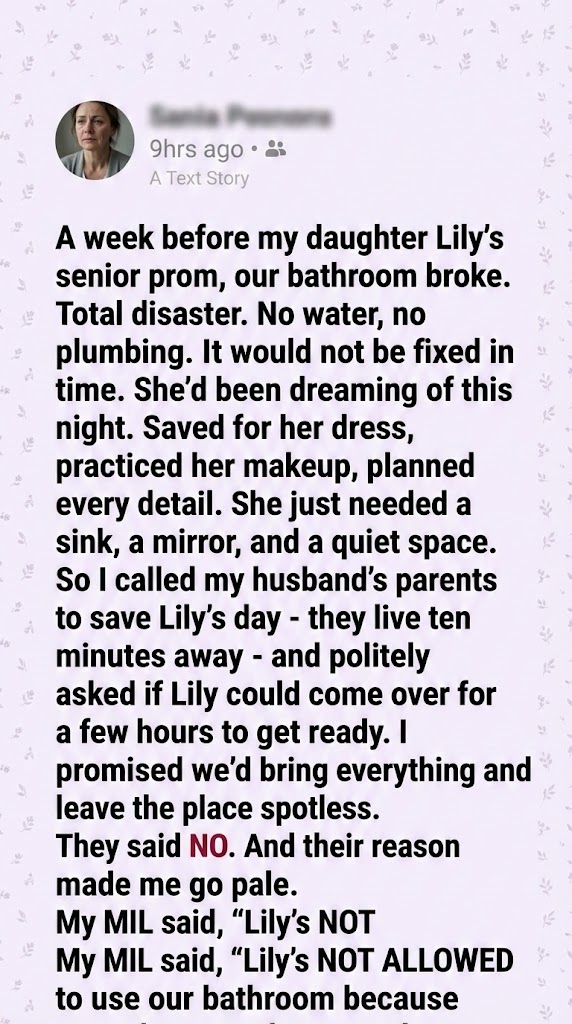 A week before my daughter Lily’s senior prom, our bathroom broke. Total disaster. No water, no plumbing. It would not be fixed in time. She’d been dreaming of this night. Saved for her dress, practiced her makeup, planned every detail. She just needed a sink, a mirror, and a quiet space.