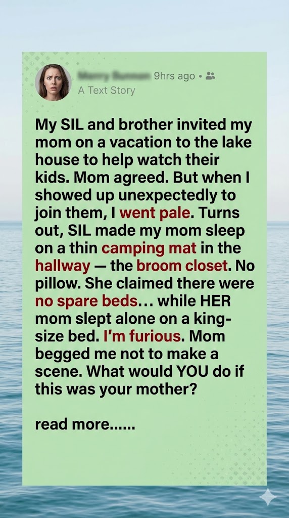 When my brother and sister-in-law invited our mom to their lake house, it was pitched as a relaxing family getaway. Mom agreed, happy to help watch the kids and spend time with loved ones. But when I arrived unexpectedly, the scene I walked into made my stomach drop.
