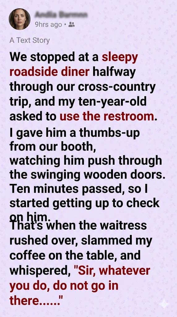 Doris gripped the edge of my table, her knuckles white. “Listen to me,” she hissed, her voice barely carrying over the drone of the ancient jukebox in the corner. “If you wait right here, he might come back out. But if you cross those doors, neither of you will.”