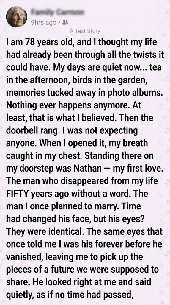 Then the doorbell rang. I was not expecting anyone. When I opened it, my breath caught in my chest. Standing there on my doorstep was Nathan — my first love. The man who disappeared from my life FIFTY years ago without a word. The man I once planned to marry.
