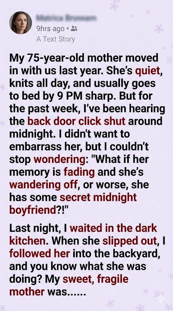 She dropped the bag of dirt with a heavy thud. She whirled around, her fists instinctively snapping up into a defensive boxer’s stance before she realized it was just me. For a moment, neither of us said a word. The crickets chirped. The motion-sensor security light clicked on, bathing us both in a harsh, unforgiving glare.