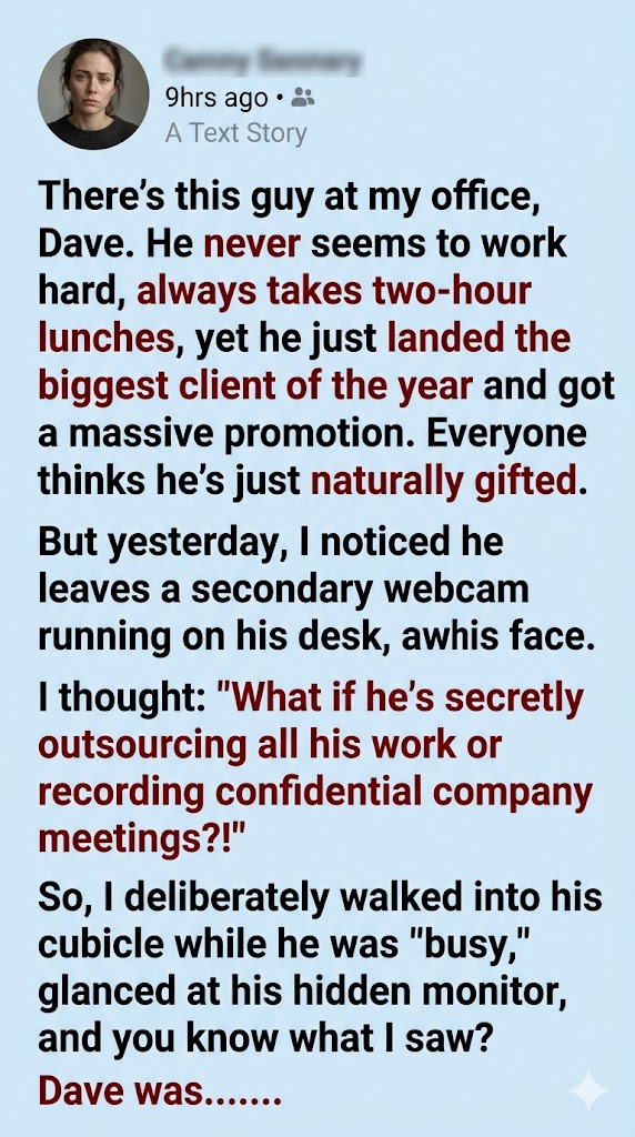 Dave slowly turned his chair to face me. He didn’t look panicked. He didn’t scramble to close the window. Instead, he just took a slow sip of his coffee, smiled lazily, and put a finger to his lips.