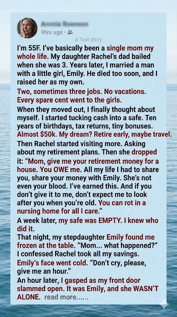 But when Rachel, her biological daughter, discovered Julie’s carefully saved retirement fund, she saw opportunity, not legacy. She demanded the money to buy herself a house, claiming it was owed to her for the struggles she endured growing up. Julie, stunned, reminded her that those struggles were hers too—and that every sacrifice had been made to shield Rachel from pain.