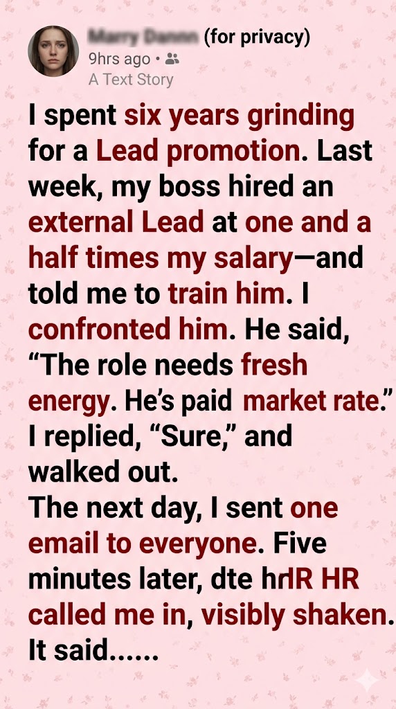 Yesterday, Dave informed me that after six years of single-handedly building and maintaining our Q4 database architecture, I was passed over for the Lead role because the position required ‘fresh energy.’ He also noted that the new hire’s salaryโ€”which is 150% of my ownโ€”was simply the ‘market rate.’