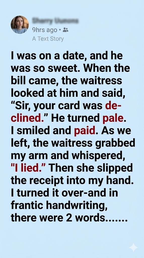 I swallowed hard, fighting a sudden, rising wave of nausea. I looked back at the waitress. She was busying herself wiping down our table, but her eyes kept darting toward me, wide and urgent. She subtly nodded toward the back of the restaurant where the restroomsβ€”and the employee-only kitchen doorsβ€”were located.