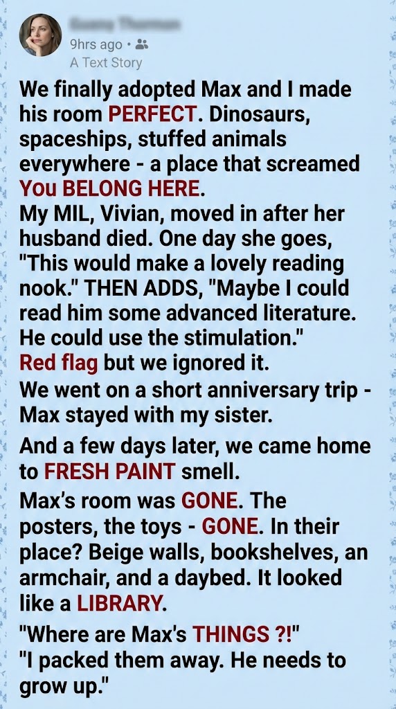 I sat on the edge of the mattress and smoothed his hair, exhausted but relieved. Vivian was gone. The walls could be repainted bright blue tomorrow. But tonight, Max was safe, surrounded by the messy, childish proof that he belonged right here.