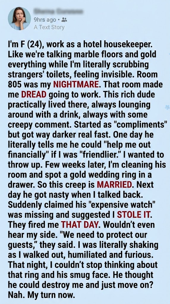 I created a burner account. I sent her a message: “Hi, Iām the housekeeper your husband just had fired. He accused me of stealing his watch because I wouldn’t sleep with him. I don’t want his money, and I don’t want the job back. But I thought you should know that when he stays in Room 805, he keeps his wedding ring hidden inside a hollowed-out bible in the bedside drawer. He also orders champagne for two on Tuesday nights. Ask him where the watch really is.”