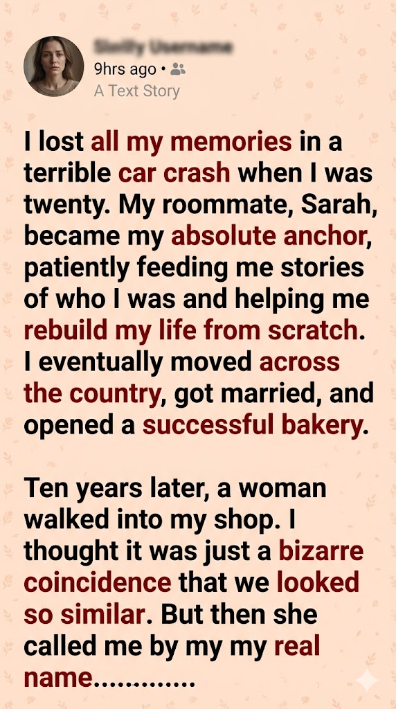 I stared at the screen, a cold, heavy dread pooling in my stomach. For a decade, I had worshipped the woman who had guided me out of the dark void of my amnesia. I had sent her flowers on Mother’s Day; I had paid for her flights to come see my bakery. Now, I realized my entire existence was a carefully curated cage.