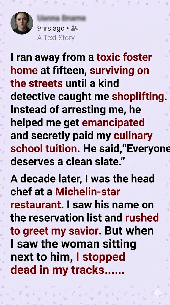 My feet felt like lead, but my chest pounded with a frantic, desperate rhythm. I crossed the dining room, smoothing my chef’s coat with trembling hands. As I approached the table, Detective Miller looked up. Age had frosted his hair, and the lines around his eyes were deeper, but his smile was exactly as warm as it had been the night he pulled me out of the back of a squad car.