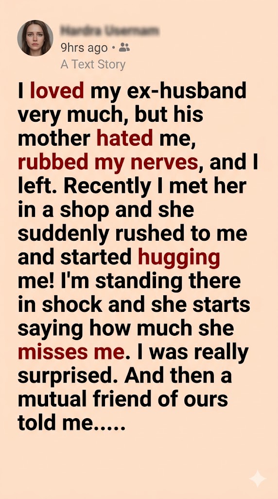 I loved my ex-husband very much, but his mother hated me, rubbed my nerves raw, and eventually, the toxic environment became too much. I left. Recently, I bumped into her at a local boutique. Before I could even pivot and walk the other way, she suddenly rushed up to me and started hugging me! I was standing there in absolute shock as she began crying, telling me how much she misses me and how the family just hasn’t been the same. I awkwardly patted her back, completely stunned.