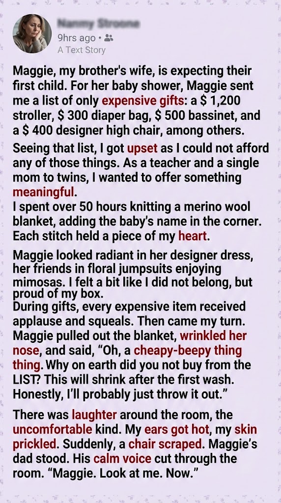 “Fifty hours,” he said, his voice shaking slightly with suppressed anger. “I know how long knitting takes because my mother did it. This woman—a single mother raising two children on a teacher’s salary—found fifty hours of spare time to make this for your unborn child. And you call it trash?”