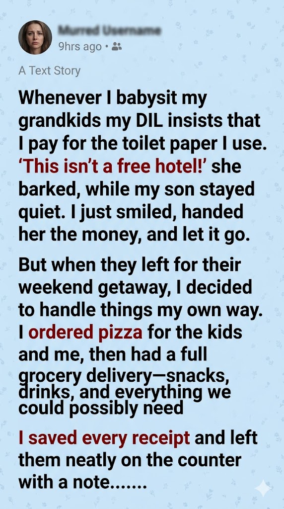 For forty-eight hours, I was on duty. I broke up arguments, wiped scraped knees, cooked meals, supervised bath times, and read bedtime stories. I did it all with a heart full of love for my grandchildrenβbut I was done letting my daughter-in-law devalue my presence while happily using my free labor.