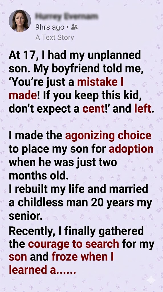 At 17, I had my unplanned son. My boyfriend told me, ‘You’re just a mistake I made! If you keep this kid, don’t expect a cent!’ and left. I made the agonizing choice to place my son for adoption when he was just two months old. I rebuilt my life and married a childless man 20 years my senior. Recently, I finally gathered the courage to search for my son and froze when I learned a…
