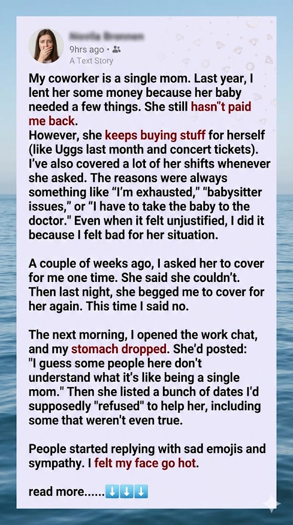 The next morning, I opened the work chat and my stomach dropped. She had posted: “I guess some people here don’t understand what it’s like being a single mom.” She then listed a bunch of dates I’d supposedly “refused” to help her, including some that weren’t even true. People started replying with sad emojis and sympathy. My face went hot with anger and embarrassment.